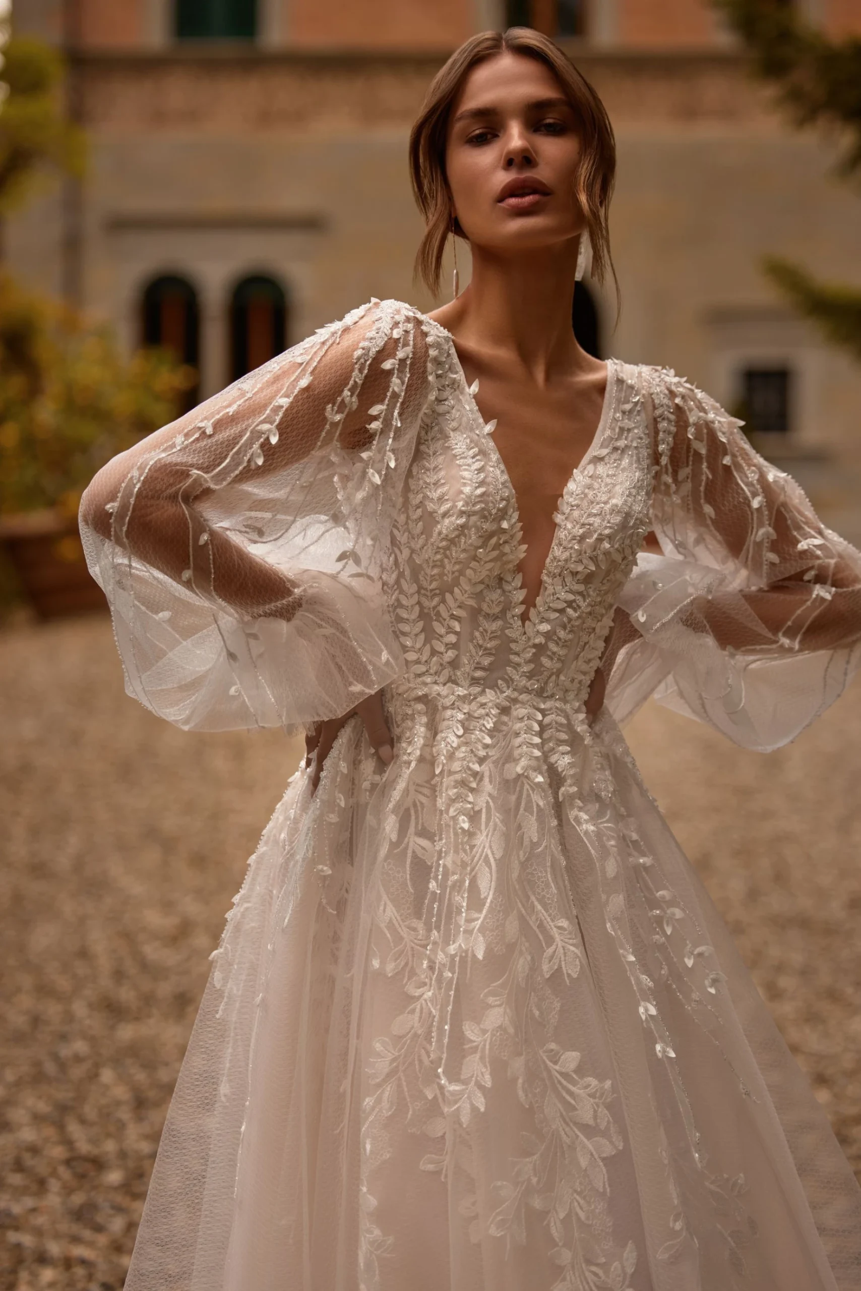 Suknia ślubna w kształcie litery A w jasnym kolorze beżu. Półprzezroczysty gorset z dekoltem w kształcie litery V, pośrodku posiada wstawkę z siateczki, która idealnie wtapia się w skórę. Gorset ozdobiony jest haftowanymi aplikacjami z efektem 3D, które płynnie przechodzą od pasa w górę, przez bufiaste rękawy sukni, aż do spódnicy. Tył kreacji wykonany jest z siateczki w kolorze nude, która dyskretnie eksponuje i podkreśla plecy Panny młodej. Dolną część pleców zdobią haftowane aplikacje z efektem 3D, które płynnie przechodzą od pasa w dół, aż do spódnicy. Tył zapinany jest na pętelki i guziki. Spódnica sukni jest obszerna, ze zwiewnym, lekkim trenem. Druga warstwa spódnicy ozdobiona jest delikatną koronką. Zapięcie stanowi ukryty zamek błyskawiczny.